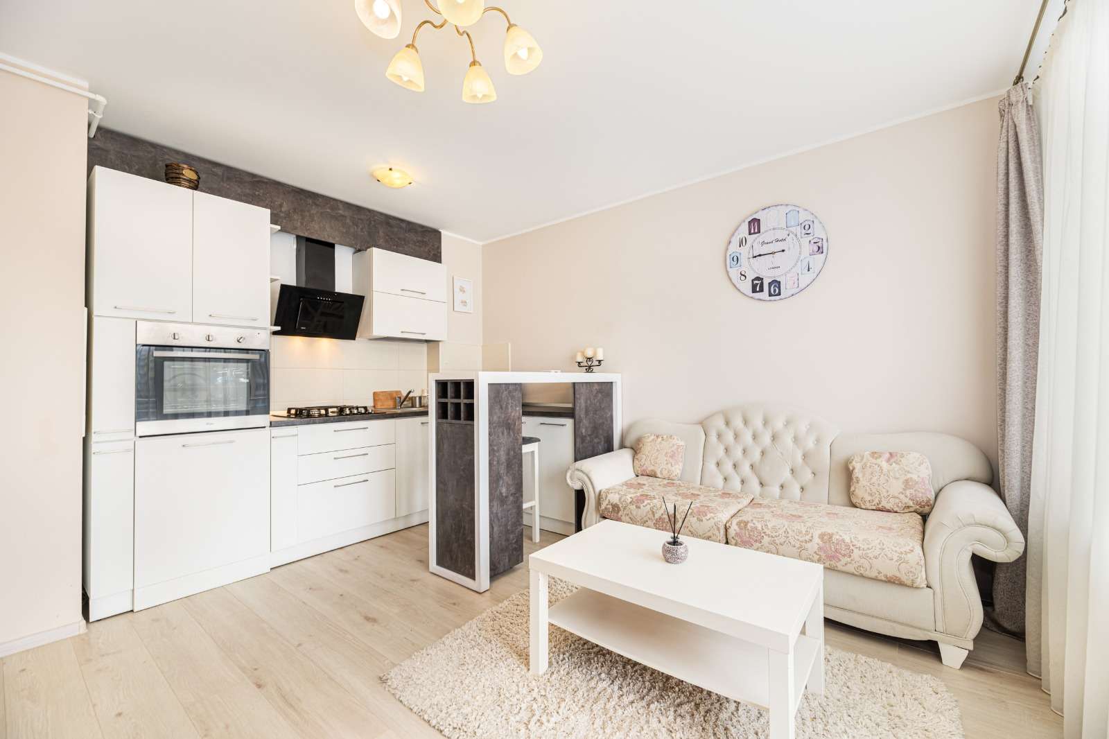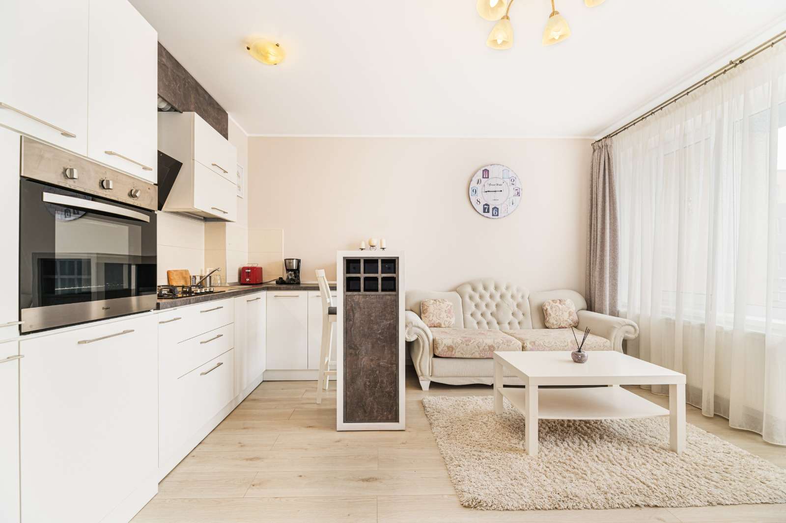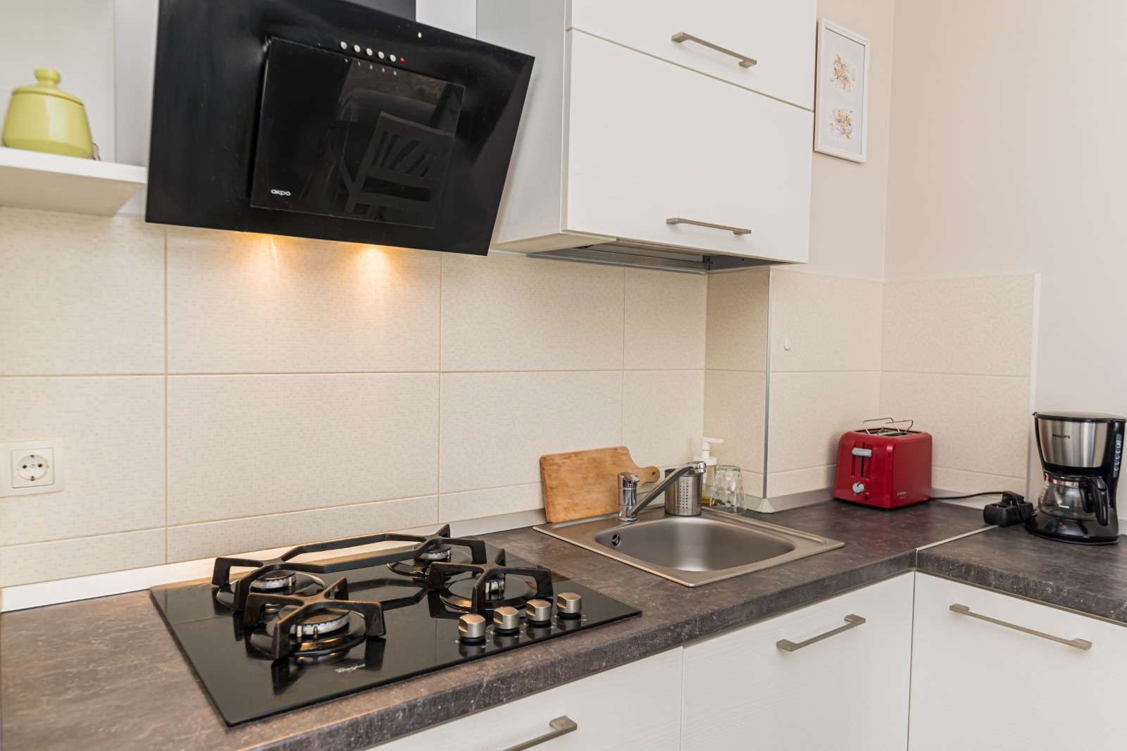 Bucatarie open space utilata complet: plita, cuptor, frigider, expresor cafea, prajitor de paine, fierbator, tacamuri si vesela.