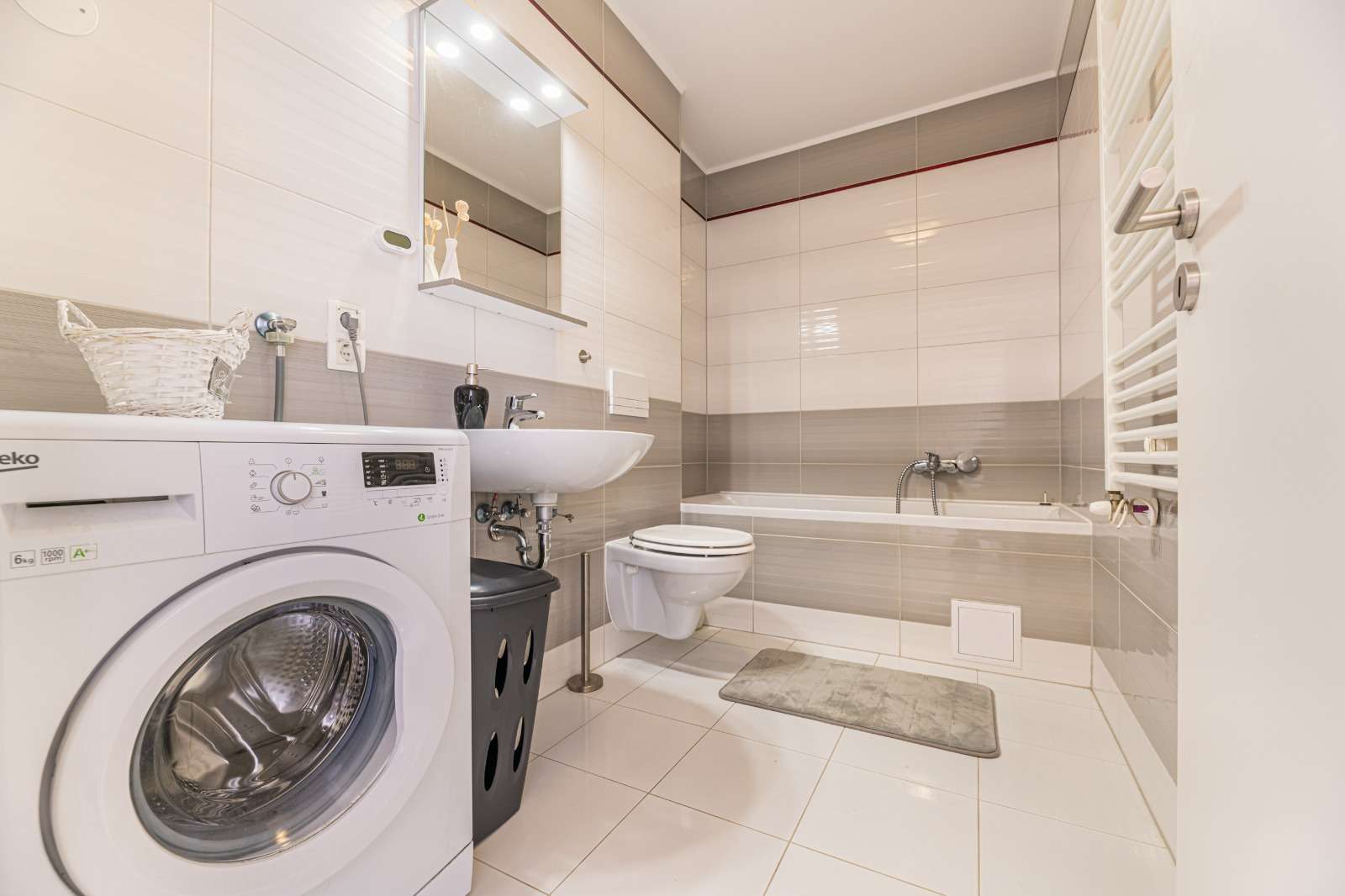 Baie moderna: cada dus, prosoape, produse cosmetice, masina de spalat rufe, uscator rufe, uscator de par, fier de calcat.
