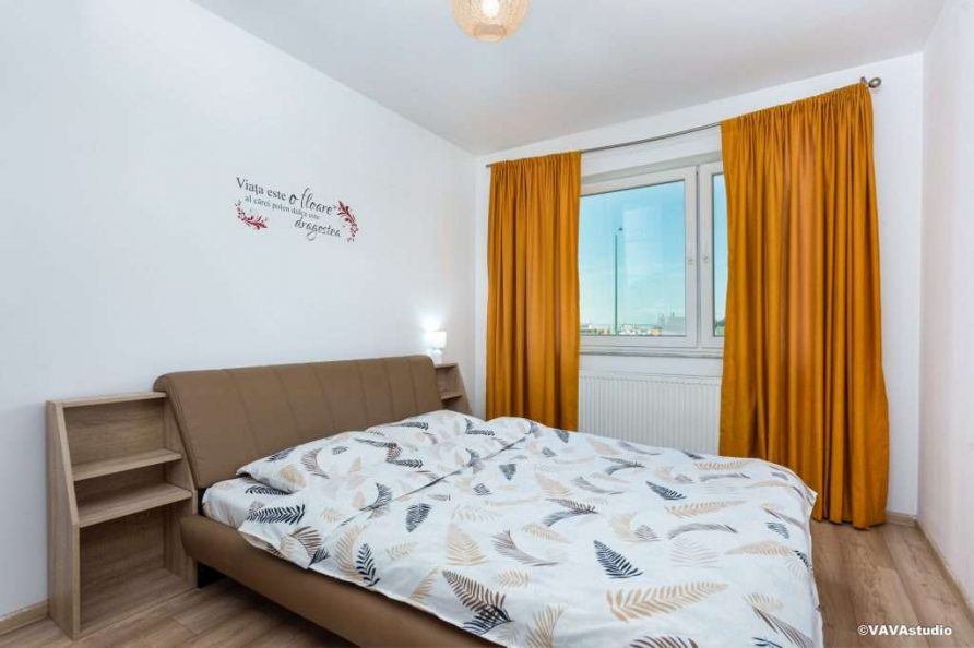 Dormitor: pat dublu 160×200, veioze, lenjerie pat, comoda