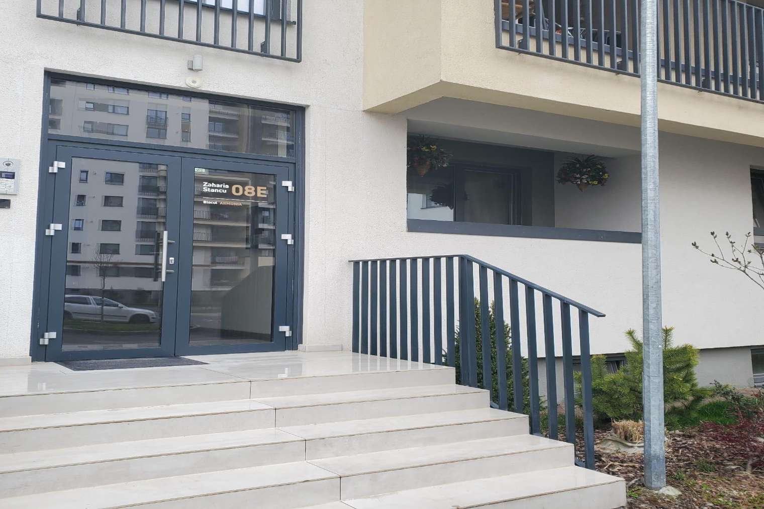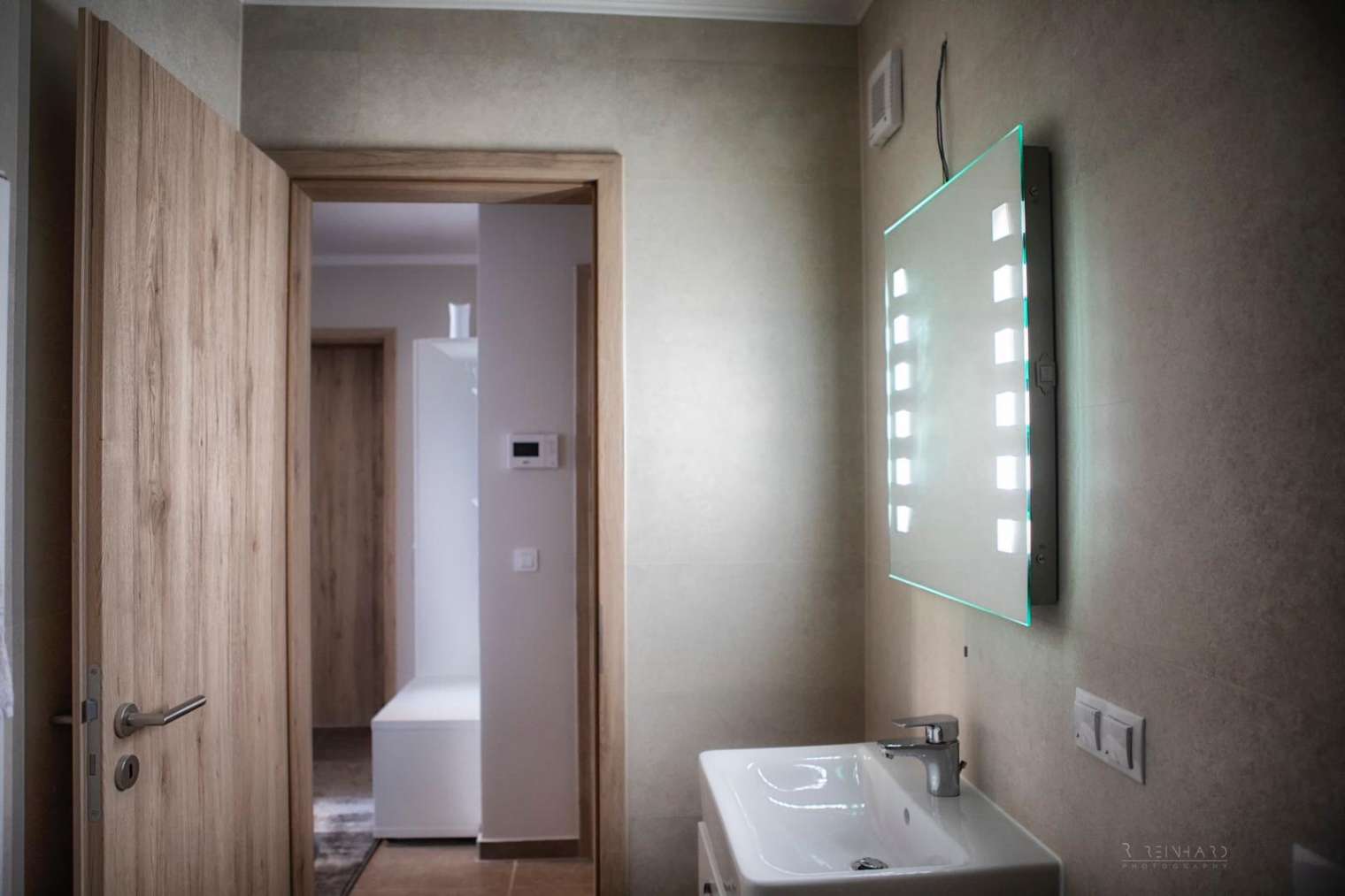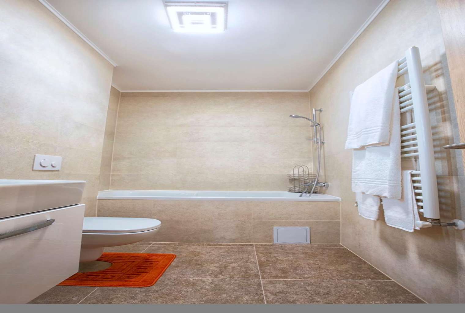 Baie moderna: cada dus, prosoape, produse cosmetice, masina de spalat rufe, uscator rufe, uscator de par, fier de calcat.