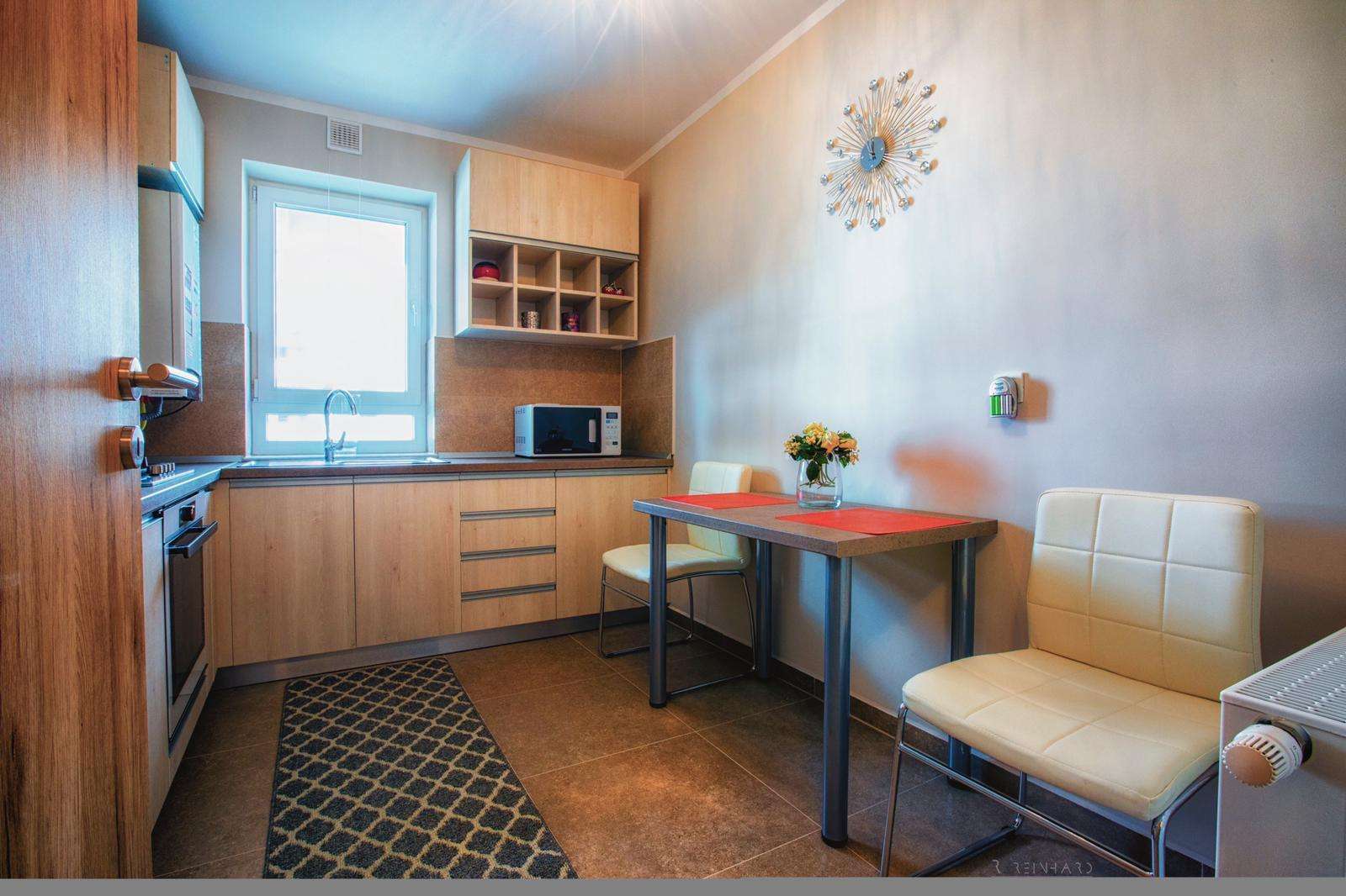 Bucatarie utilata complet: plita, cuptor, cuptor cu microunde, frigider, expresor cafea, fierbator masina de spalat vase, tacamuri si vesela.